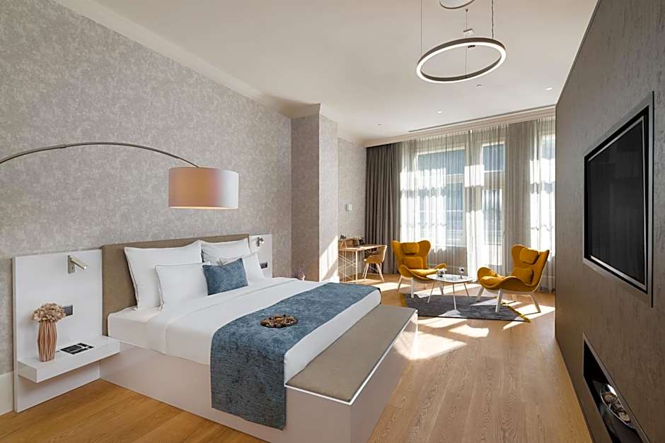 This suite offers panoramic views over the Danube, a living room with kitchenette and a dining table. A coffee machine, flat screen TV are provided. The bathroom is equipped with a rain shower, a stand alone bathtub and luxury toiletries.